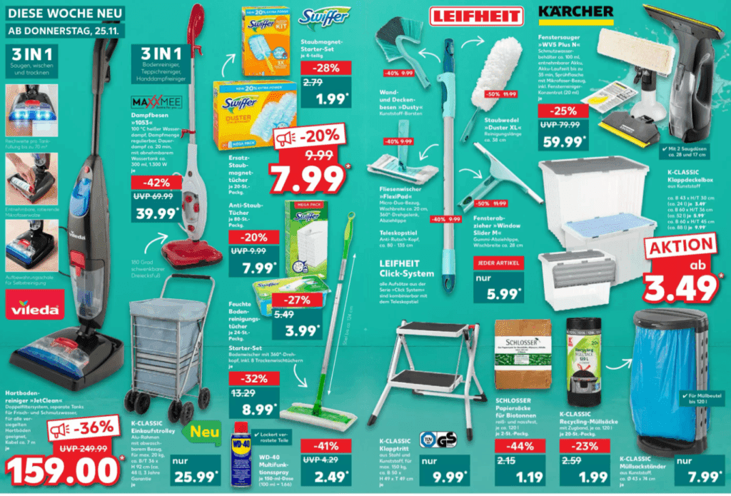 - أداة تنظيف ثلاثة بواحد (تكنيس، مسح، تجفيف) بتخفيضات 36%، السعر: 159 يورو.