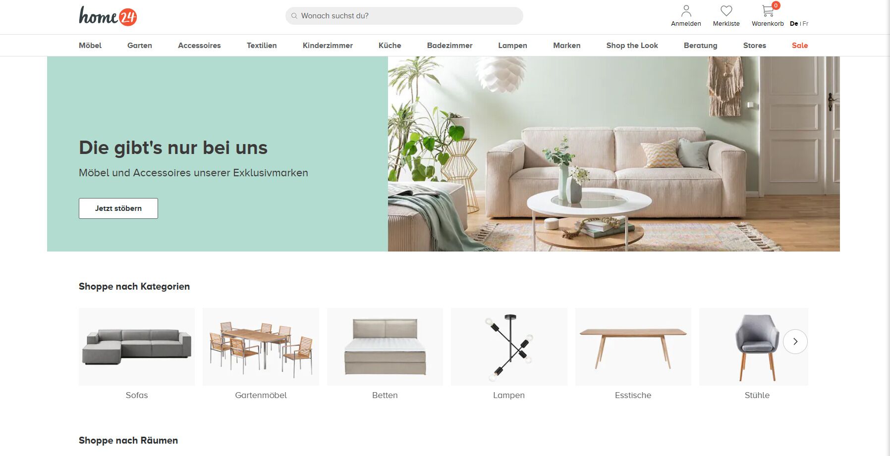 واجهة موقع هوم 24، home24 في سويسرا للأثاث